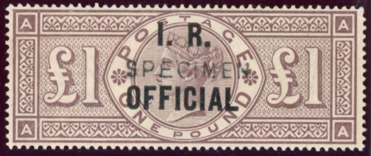 A very fine unused original gum example of the 1885 £1 brown-lilac I.R. Official, watermarked Crowns, lettered 'AA', with a clear “SPECIMEN” type 11 overprint.