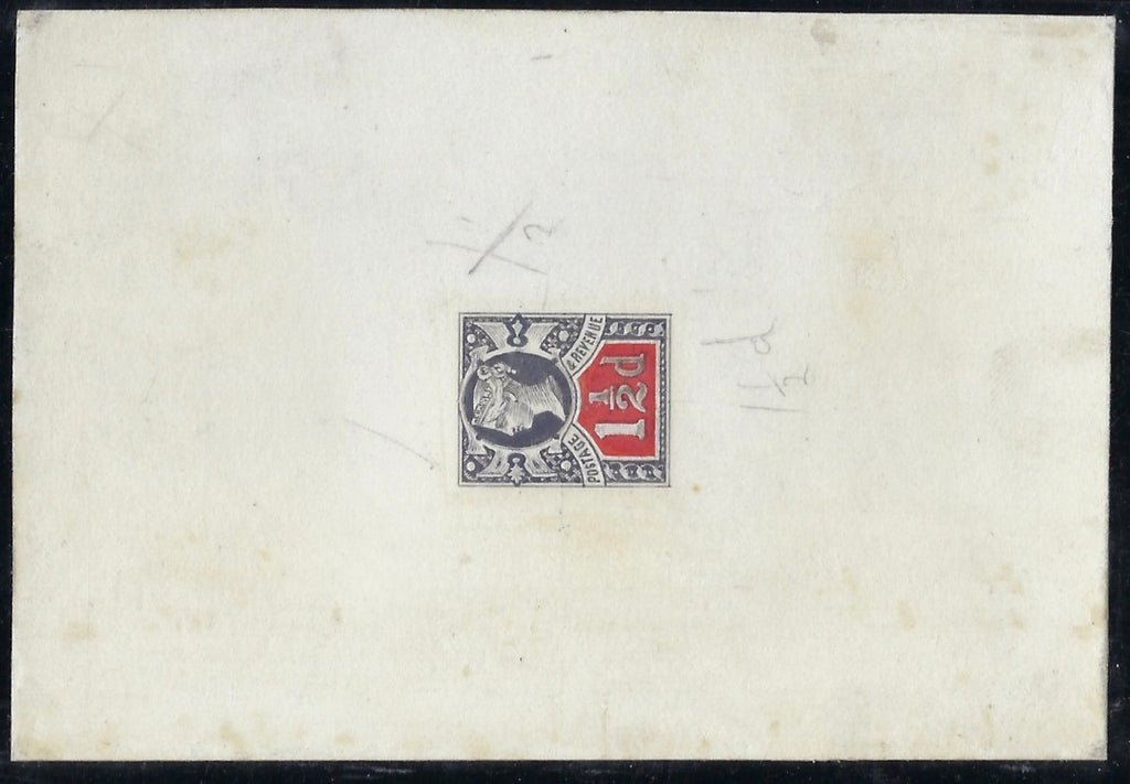 Very fine hand painted essay in dull lilac and carmine with the details of the design highlighted in Chinese white, executed on a piece of white card (80x116mm). Endorsed '1½d', from the 'Patch of colour' type series with the Queens head on a sold background.