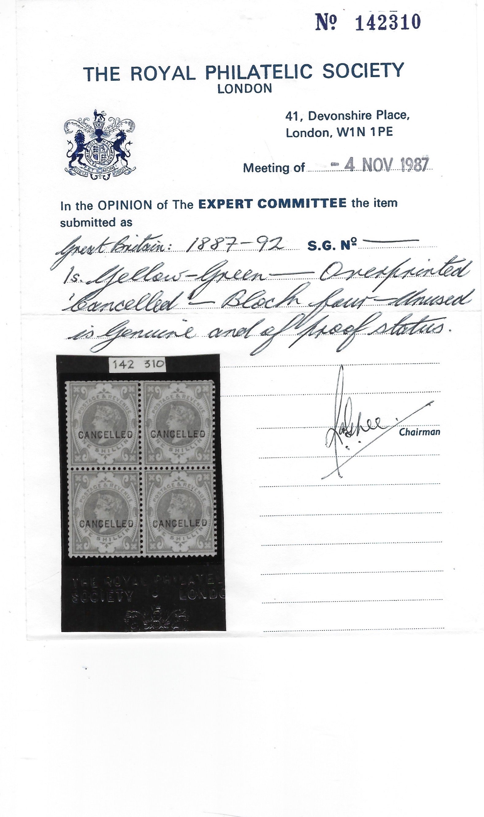 Accompanying 1987 Royal Philatelic Society certificate describes them as of "PROOF STATUS", believed to have been used for Post Office fugitive ink trials, hence the unusual colour as seen on all the 1887 colour standards.