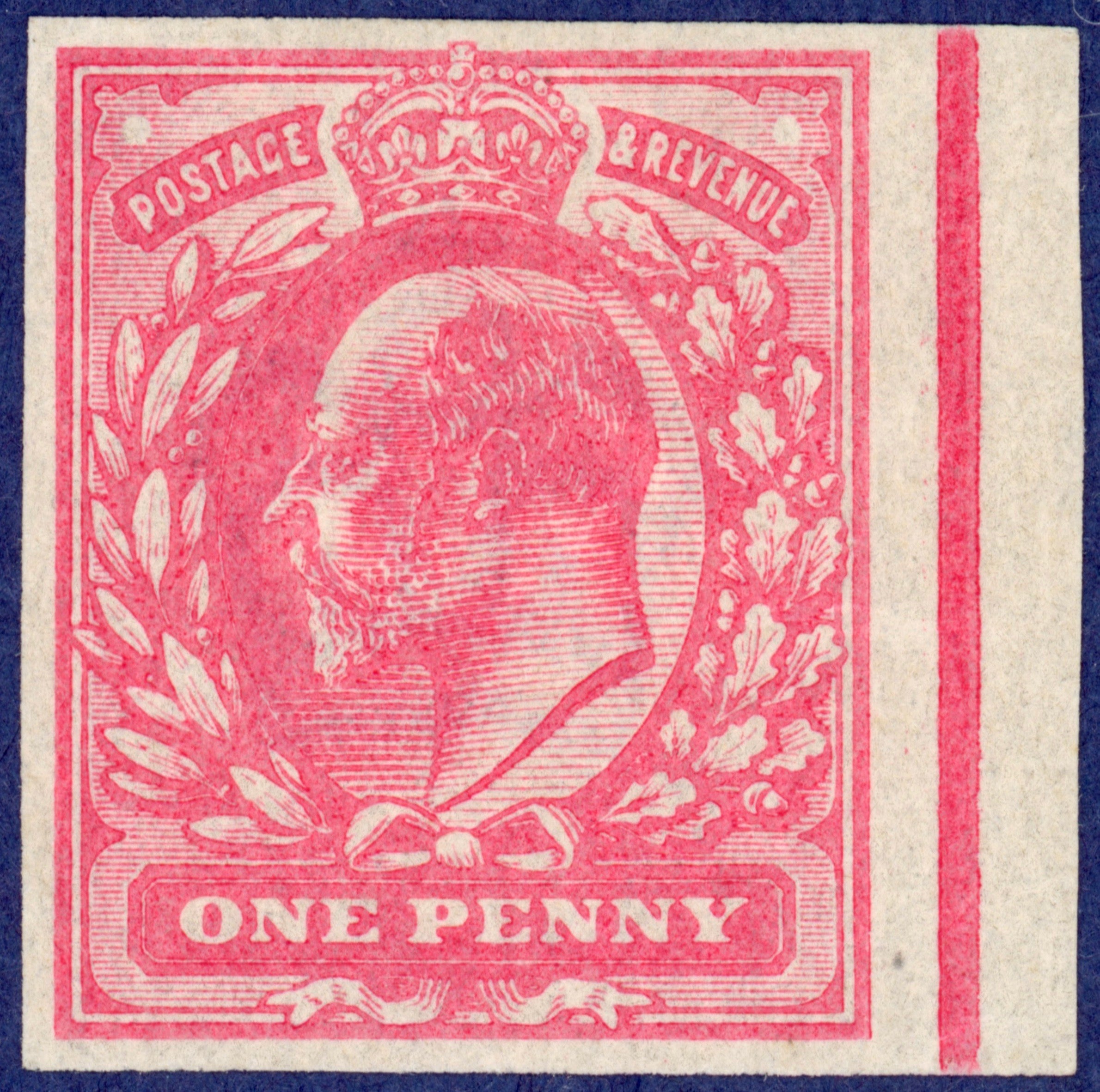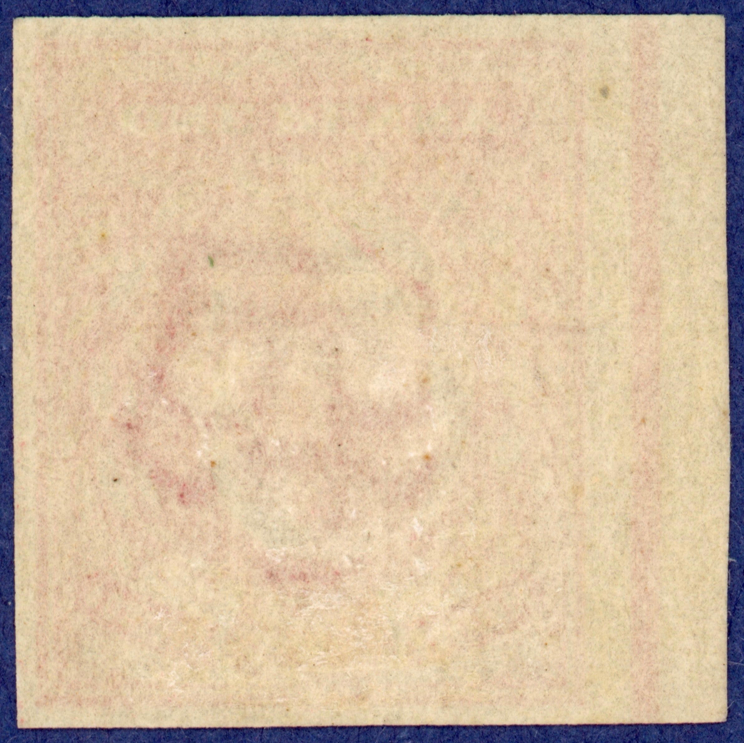 A very fine unused, with original gum, imperforate right hand marginal example printed in cerise on "Crown" watermarked paper.