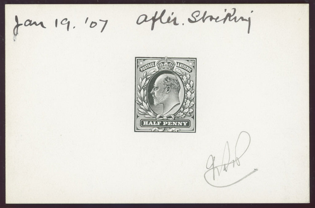 A very fine example printed in black on white glazed card (92 x 60mm), dated in manuscript "Jan 19 1907", endorsed in manuscript "AFTER STRIKING" and initialed at foot.