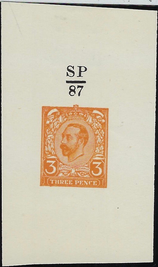 Very fine example printed in deep bright orange on white wove paper (42 x 73mm) with handstruck "SP/87" above design.