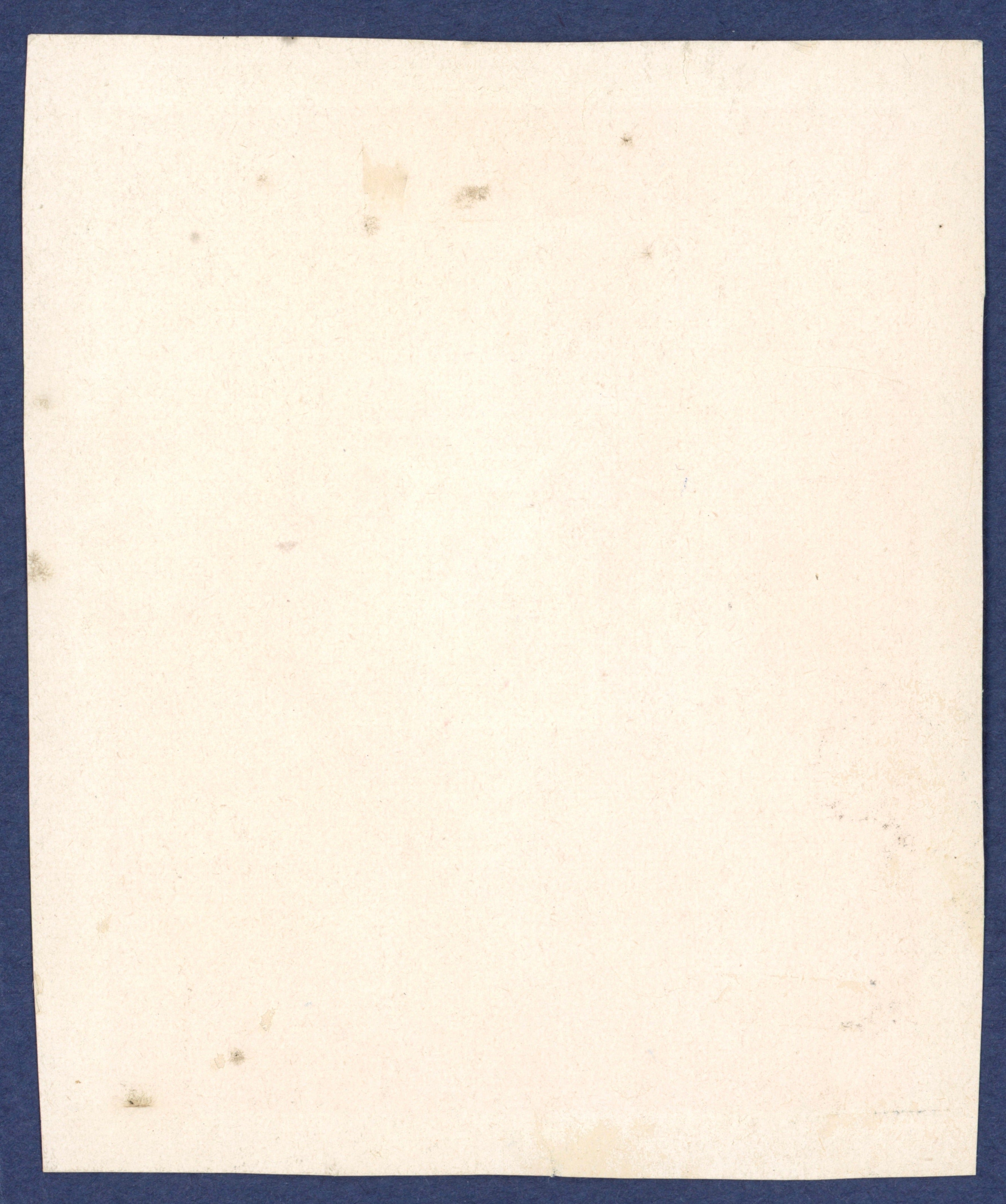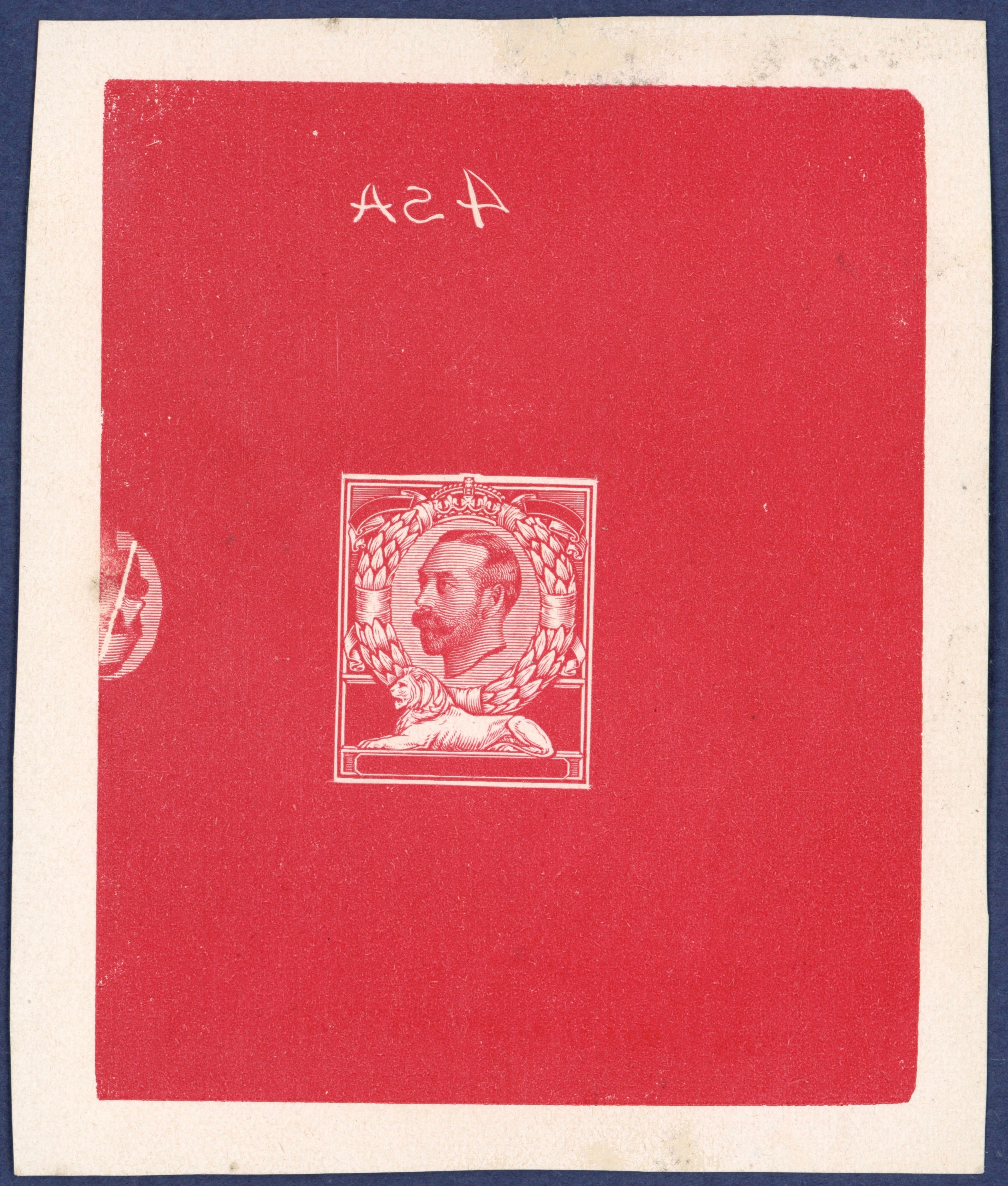 The piece shows part of an additional inverted head which has been defaced at left and "4SA" reversed at top. Printed in scarlet on white glazed proof paper (72x86mm).