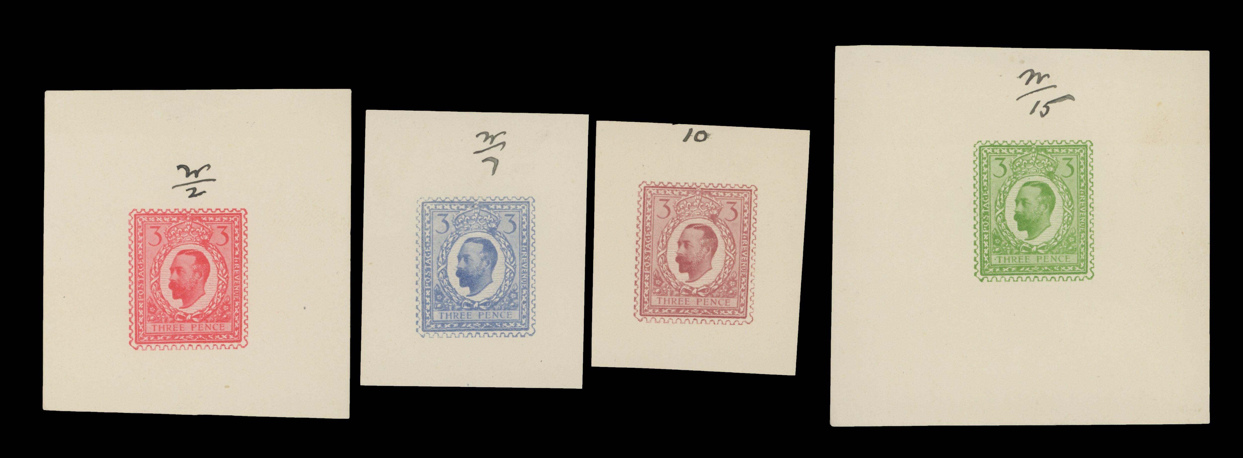 A very fine group of stamp essays in four different colours, red, blue, brown and emerald, each with a reference number above design W/2, W/7, W/10 and W/15 respectively.