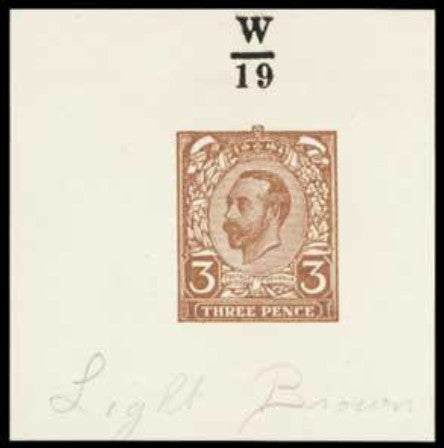 Great Britain 1911 3d Hentschel Essay (second proof). A very fine imperforate colour trial printed in light brown (Winston ink No. 19) on white unwatermarked paper, endorsed at top "W/19" and "Light Brown" at foot. A very scarce specialised item.