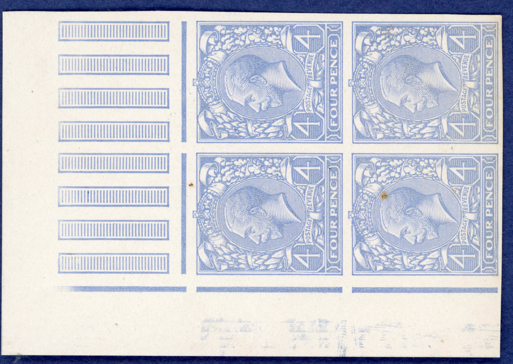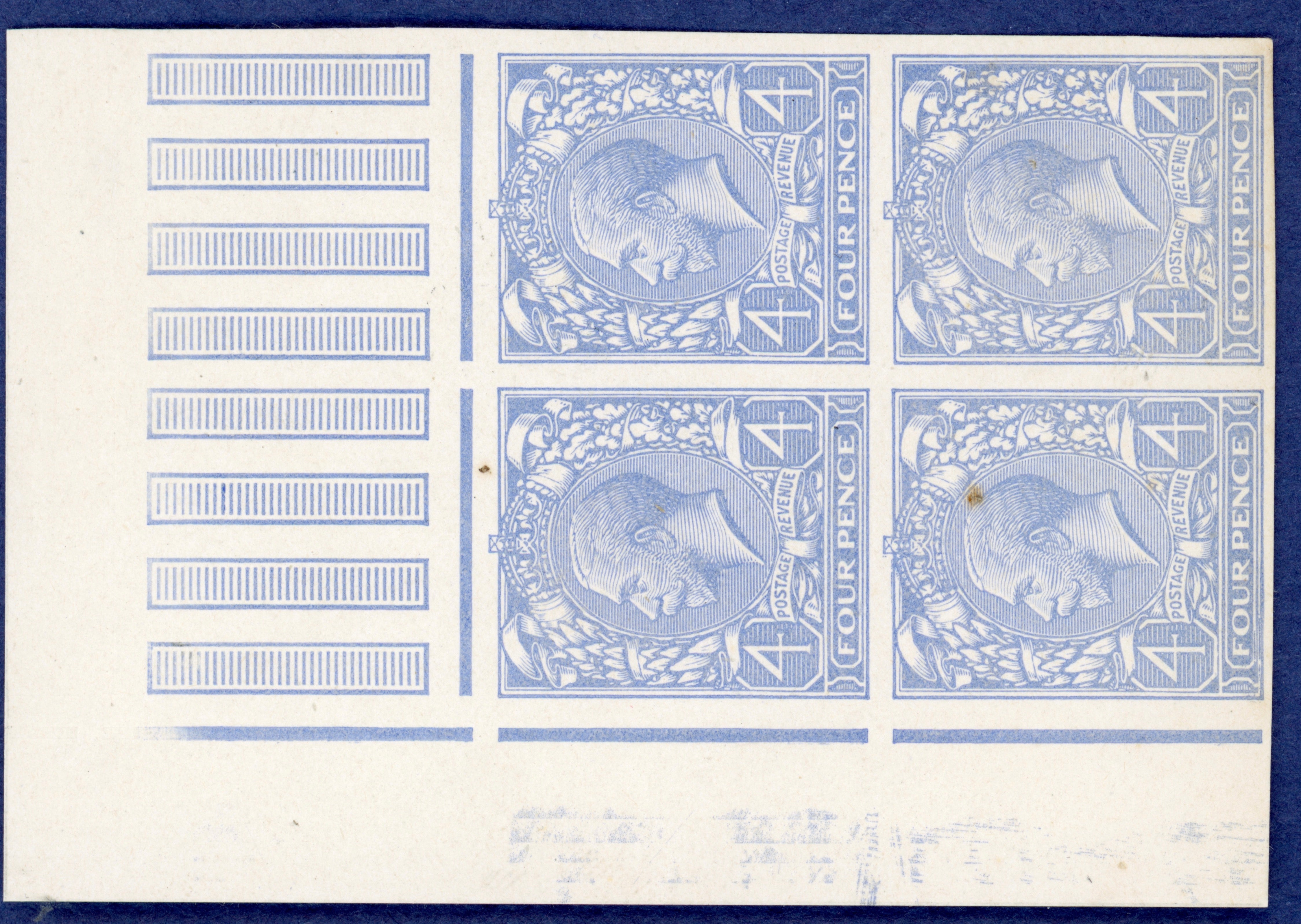 A very fine unused top left hand corner marginal block of four plate proofs printed in pale ultramarine on thick paper. Insignificant tone spots in top margin and on bottom left hand stamp, nevertheless a fantastic multiple of the rare and desirable King George V proof.