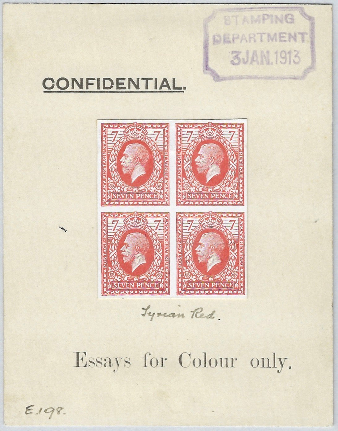 A very fine ungummed imperforate block of four essays (Fig 30a) in tyrian red on white unwatermarked card mounted on thick card (88x103mm). Showing "CONFIDENTIAL" and "Essays for colour only." ink manuscript "Tyrian red" below the stamps and "E198" at lower, purple "STAMPING DEPARTMENT/3 JAN.1913." handstamp at the top right.