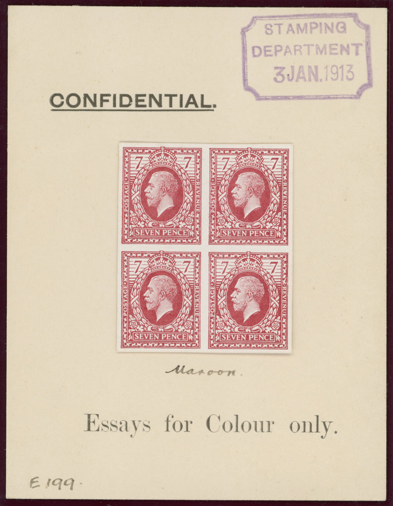 The display card shows "CONFIDENTIAL" and "Essays for Colour only.", ink manuscript "Maroon" below the stamps and "E199" at lower left, purple "STAMPING DEPARTMENT/3 JAN. 1913." handstamp at the top right.