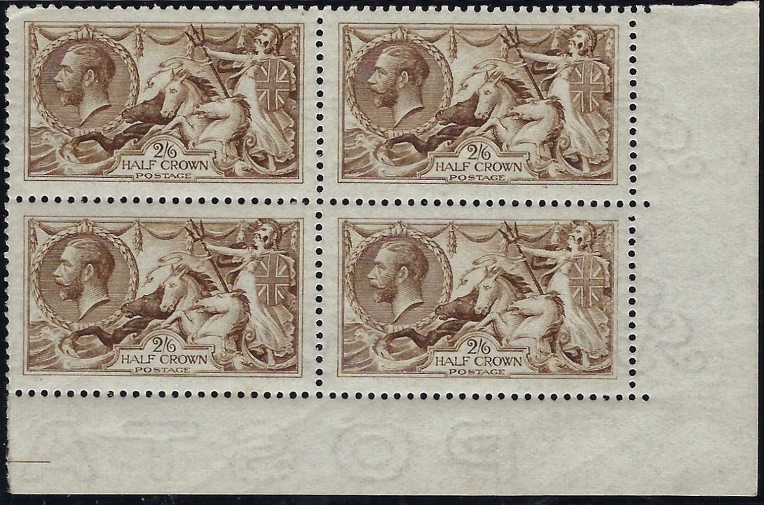 Great Britain 1915 2s6d Yellow brown (watermark reversed). Very fine unused original gum perfectly centred bottom right hand marginal block of four (three stamps unmounted original gum) of this rare watermark variety which is also dramatically misplaced and bisected between the stamps, the watermark clearly showing in sheet margin. Light gum wrinkles as usually seen not detracting from this magnificent and very rare multiple. Spec N64(6)G. SG406wj