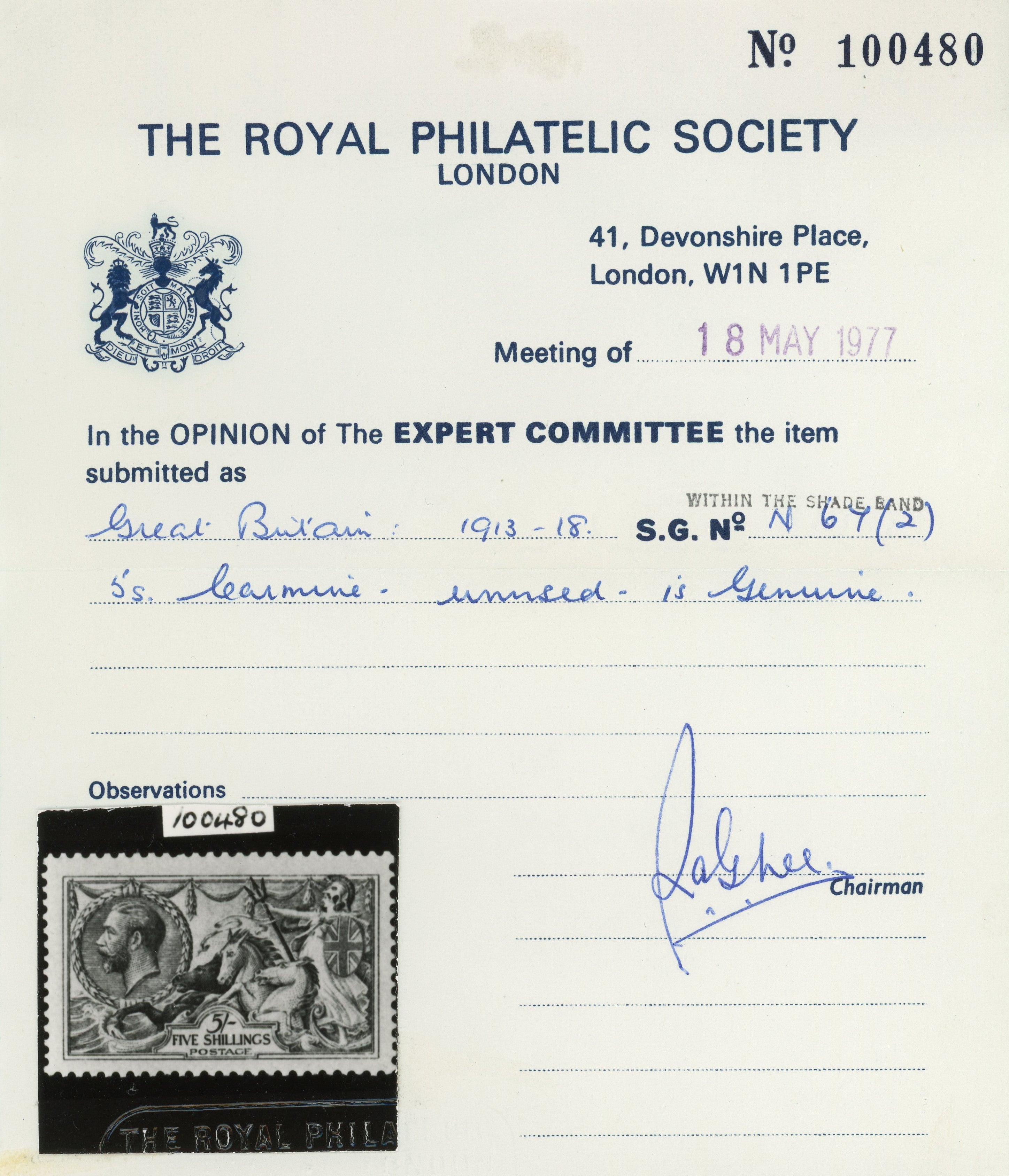 Accompanied with a 1977 Royal Philatelic Society (RPS) Certificate of Authenticity.
