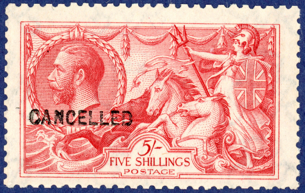 Great Britain 1920 5s rose red "Seahorses" (23mm high, Royal cypher paper trials), SG416var.