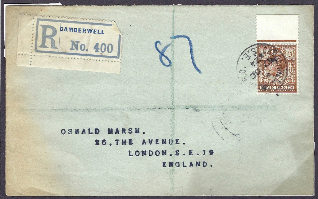 A very fine used marginal example tied to a 'Marsh' registered envelope by a Camberwell Green S.E. circular date stamp for OC.17.1924, the first day of issue.