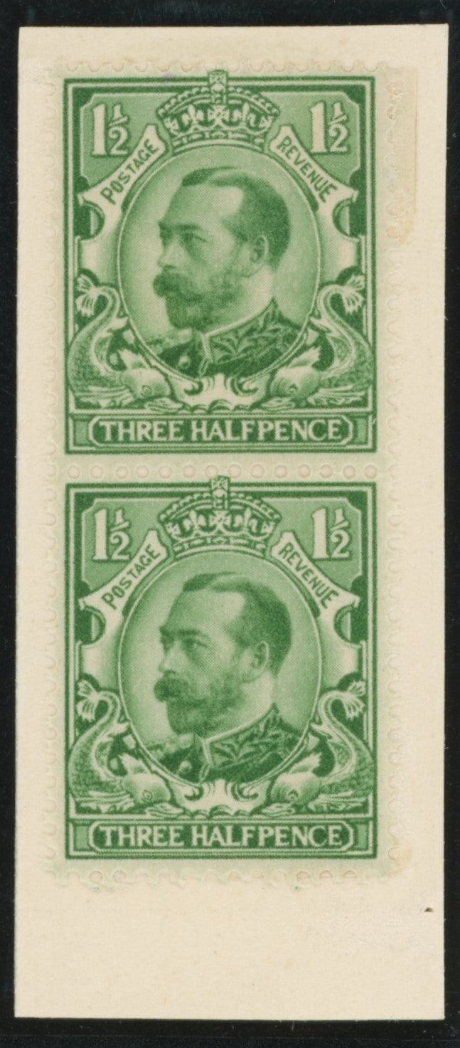 A very fine vertical pair of perforated essays printed by Harrison & Sons on "Harrison" script gummed watermarked paper, mounted on a small piece of cream card. Printed in green and using the 3/4 portrait design (Type F) from a photograph by W.D. Downey.