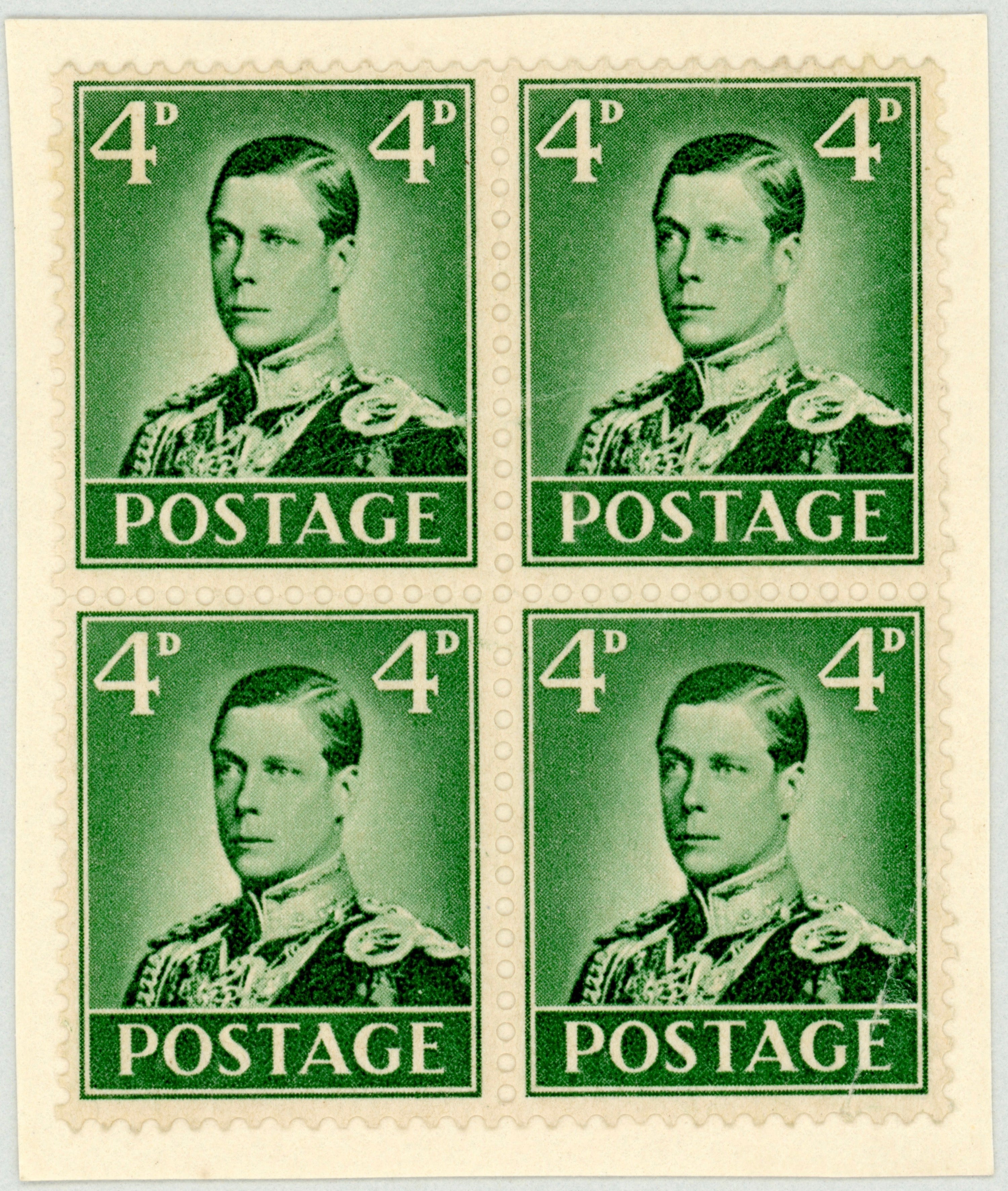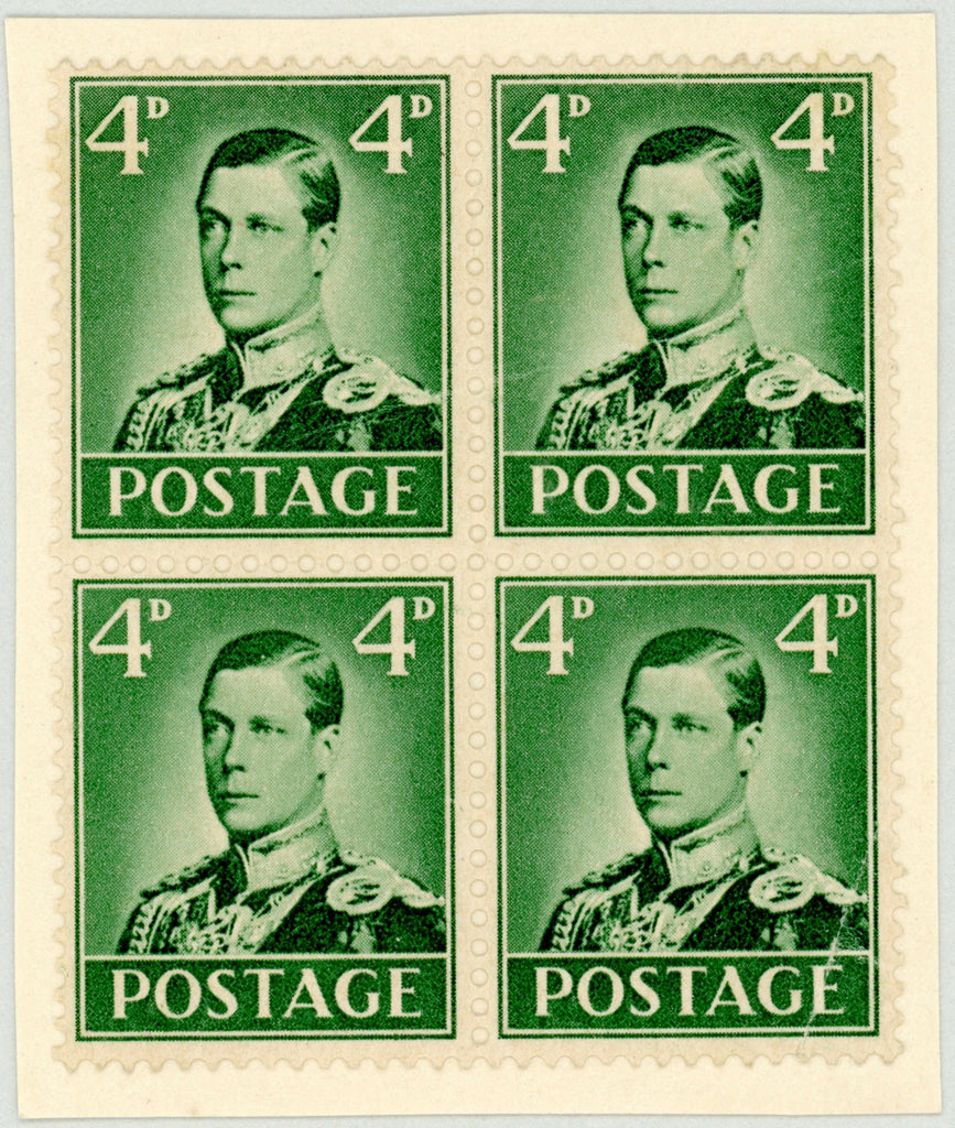 A very fine block of four printed in emerald green on gummed "GvR" watermarked, ordinary uncoated paper, depicting the King in the uniform of the Seaforth Highlanders from the photograph by Bertram Park (Design Type B). Light corner crease at lower right.