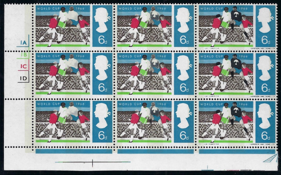 Superb unmounted mint with full original gum left hand corner marginal cylinder block of 9 with black (Goalkeepers Jersey and '1E' cylinder) omitted from the first column and partially omitted on the second.