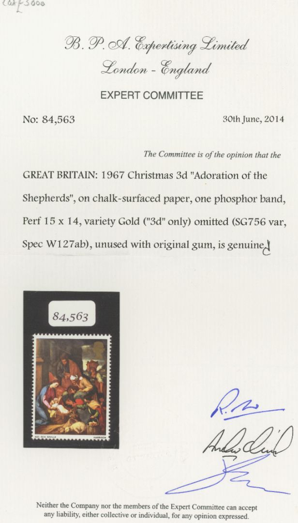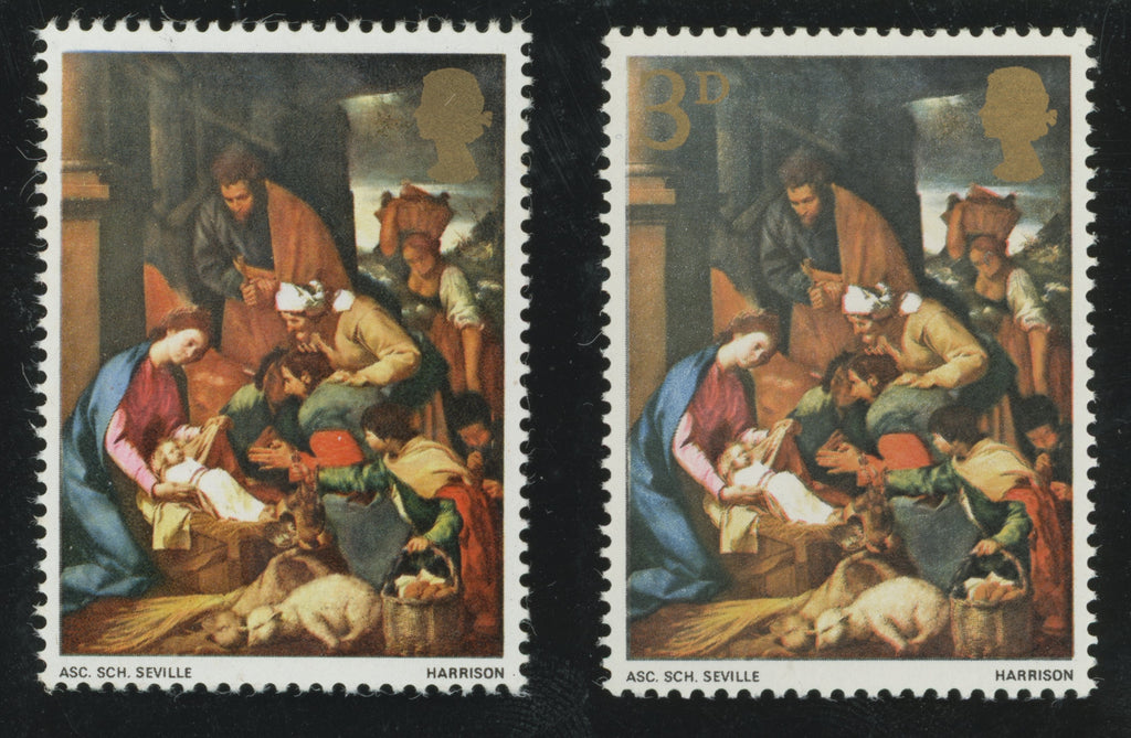 Great Britain 1967 3d Christmas Paintings "The Adoration of the Shepherds (School of Seville)" error, SG756ac.