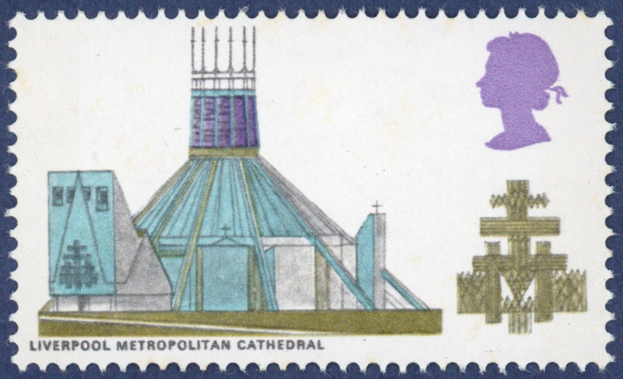 A classic Queen Elizabeth II stamp error of the Liverpool Metropolitan Cathedral stamp issue.