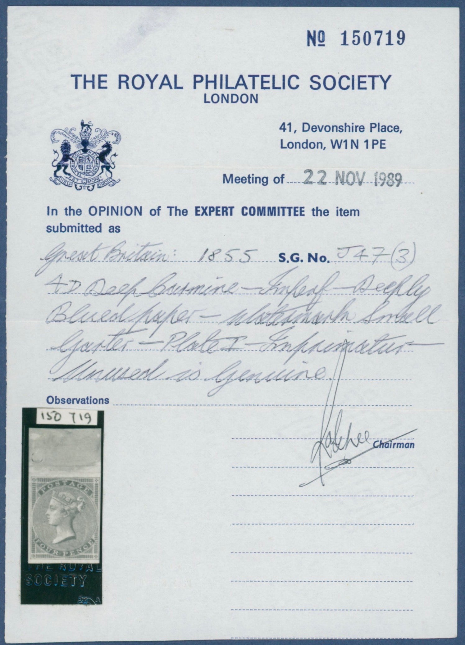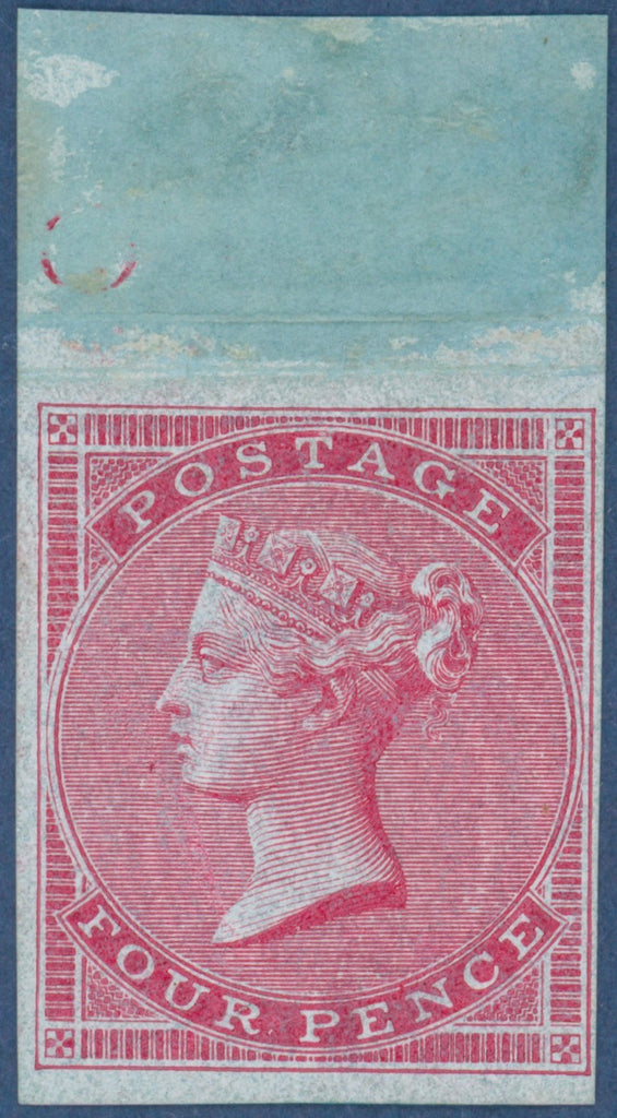 Great Britain 1855 4d deep carmine imprimatur Plate 1 on deeply blued paper, SG62var.