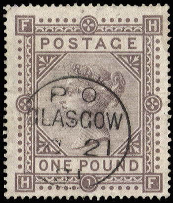 Great Britain 1878 £1 Brown lilac Plate 1. Very fine used well centred example lettered HF, neatly cancelled by a crisp Glasgow circular date stamp for OC.21.1881. Most attractive.