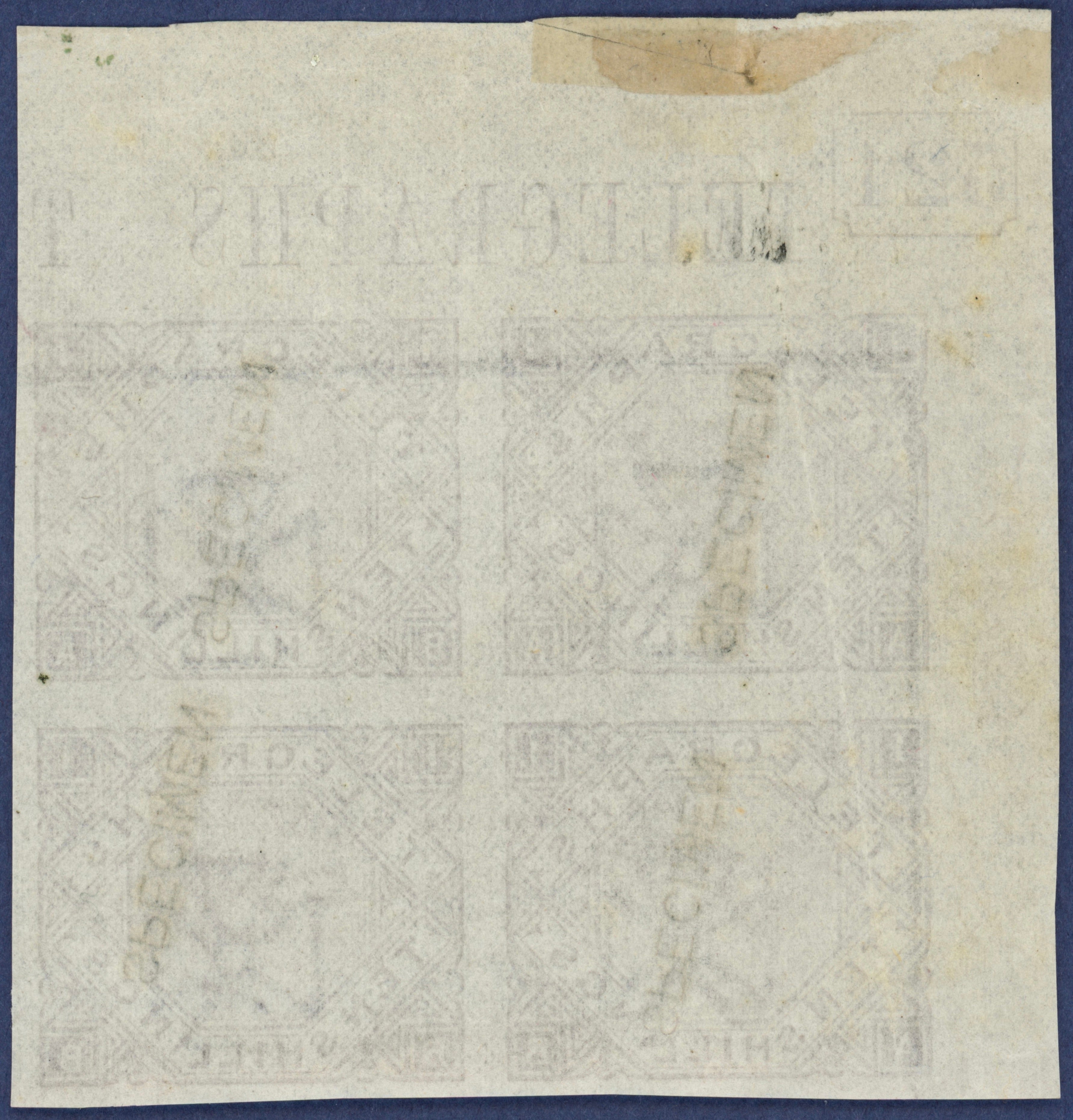 A very fine imperforate unmounted mint, with full original gum, corner marginal colour trial block of four in dull mauve lettered 'AA-BB', complete with sheet inscription and warrant number. Each stamp is overprinted "SPECIMEN" type 8 (inverted).