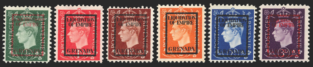 Grenada 1944 German propaganda forgeries of Great Britain 1937-47 set of 6 to 3d, each with boxed overprint 'LIQUIDATION OF EMPIRE/GRENADA' in red (½d, 3d) or black.