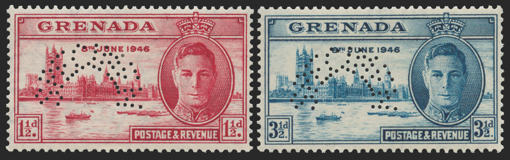 Grenada 1946 Victory 1½d carmine and 3½d blue, perforated 'SPECIMEN' (type D21), SG164s/5s.