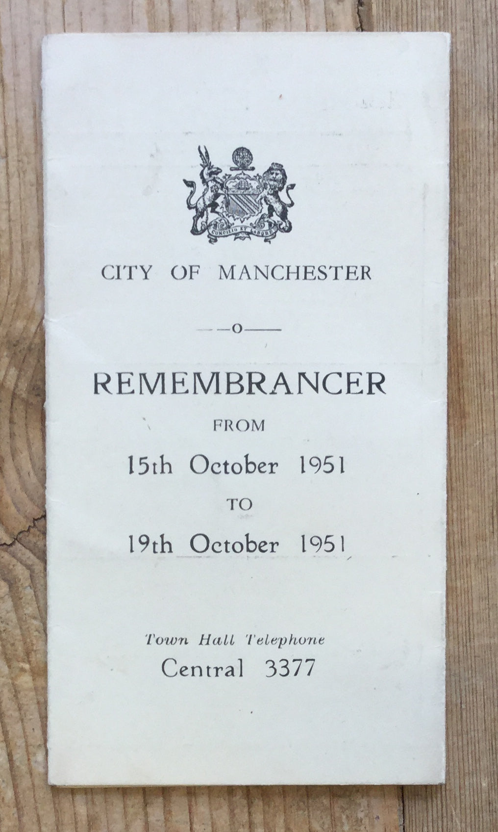 A striking ink signature on a foldout City of Manchester “remembrancer” booklet of council meetings, for October 15-19, 1951.