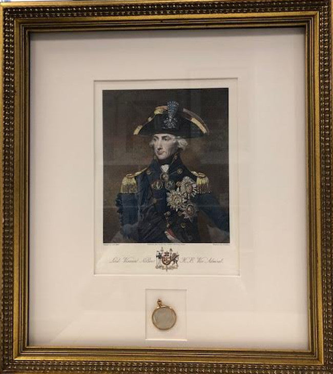 The locket is displayed below a striking image of Lord Nelson. The piece is attractively framed to an overall size of 45 by 40 cm.