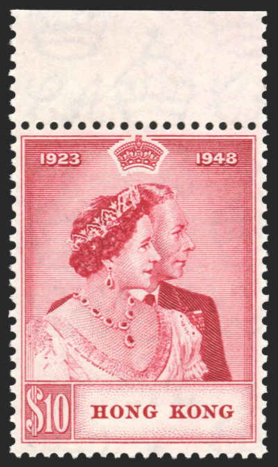 Hong Kong 1948 Royal Silver Wedding $10 carmine, upper marginal, SG172.