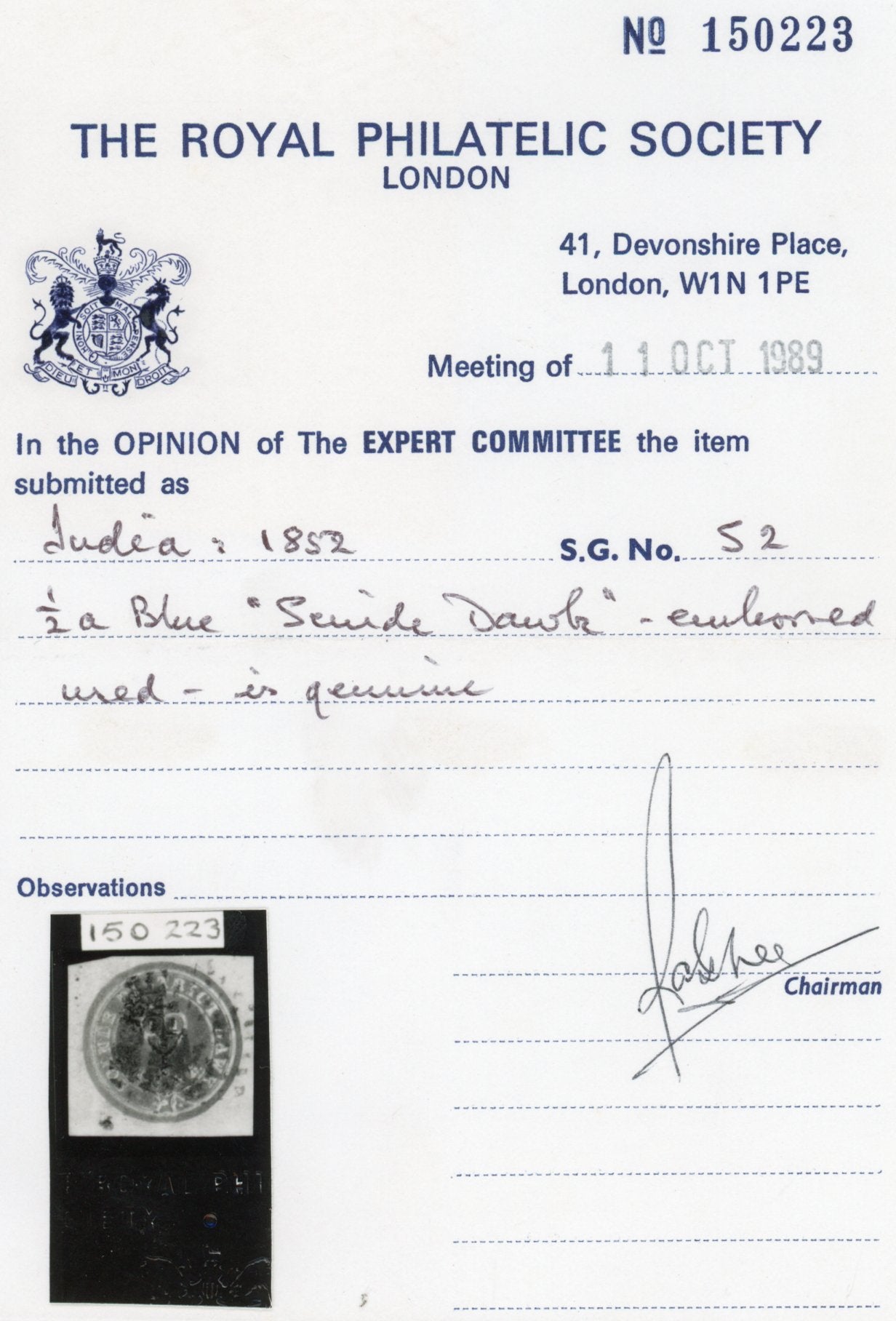 Accompanied with a Royal Philatelic Society Certificate of Authenticity (1989).