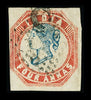 India 1854-55 4a blue and red, 2nd printing (head die II, frame die I), position 4 on sheet, good margins except close at left, showing marked upward misplacement of head, lightly cancelled by type 6 numeral (probably 'C-111' of Pondicherry, French India). Faint bend at right but a fresh and attractive example, scarce with this degree of misplacement. Used. SG 19