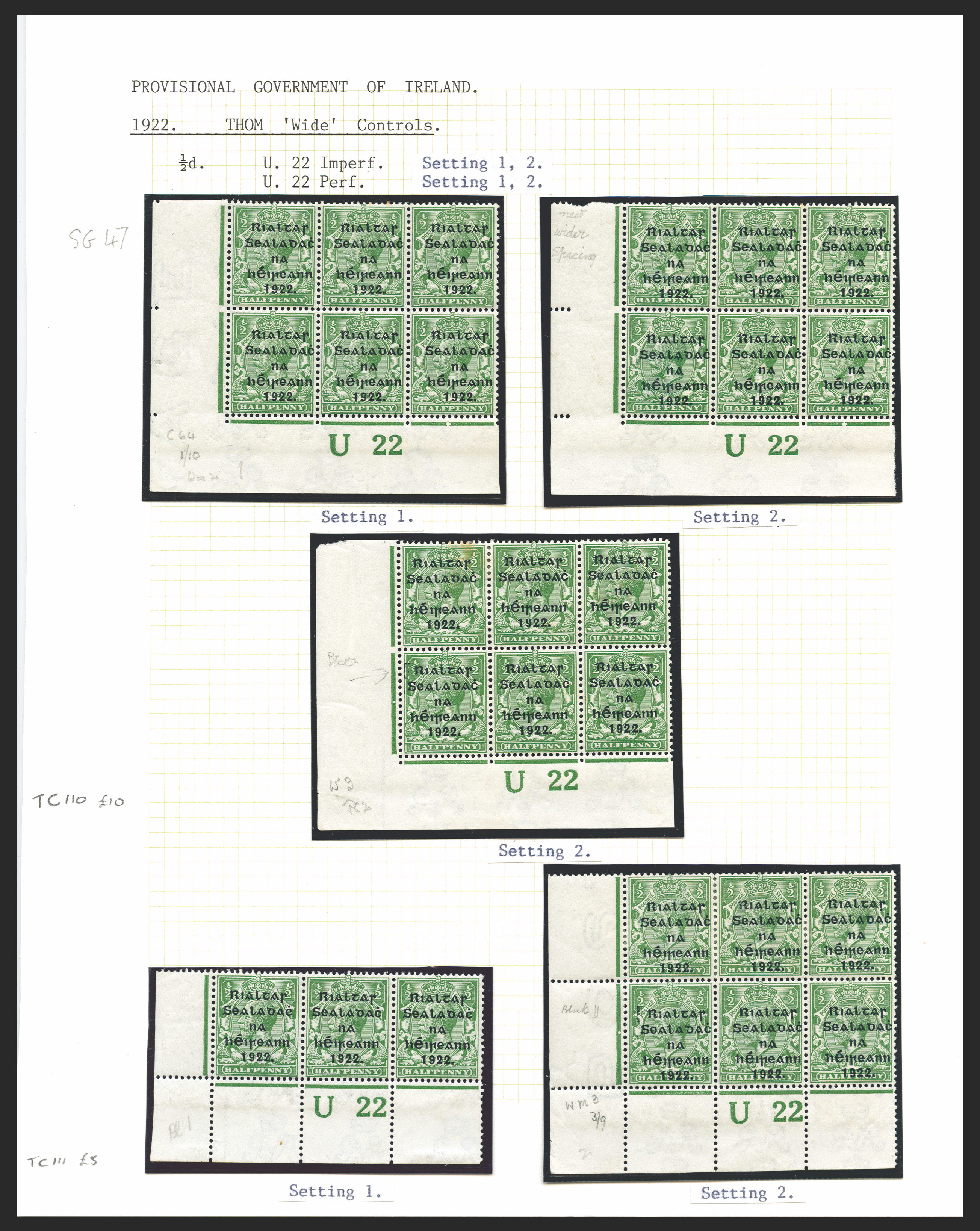 Ireland 1922 Thom type 4 (wide) overprint in blue-black, range of 17 control pieces, mostly corner strips of 3, mounted on 4 pages with Irish overprint plates identified, SG47/51.