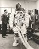A fantastic full length, black and white photograph of James Irwin pictured in his spacesuit, prior to a test.