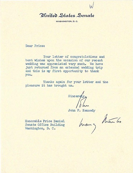 - A 1953 John F Kennedy typed and signed letter as US senator, discussing his wedding with Jacqui and honeymoon