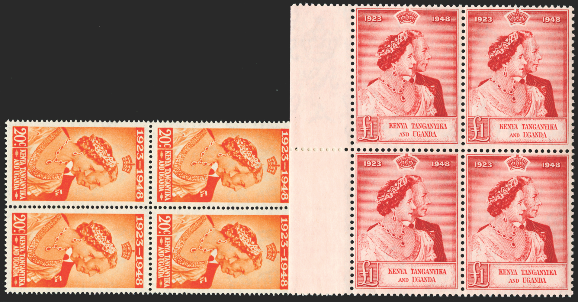 Kenya, Uganda and Tanganyika 1948, Royal Silver Wedding 20c orange and £1 scarlet, marginal blocks of 4, SG157/8.