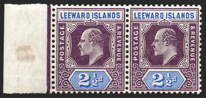 Leeward Islands 1905-08 2½d dull purple and ultramarine, watermark MCA, horizontal pair from left of sheet, the left stamp showing 'Double frame line at left', SG32.