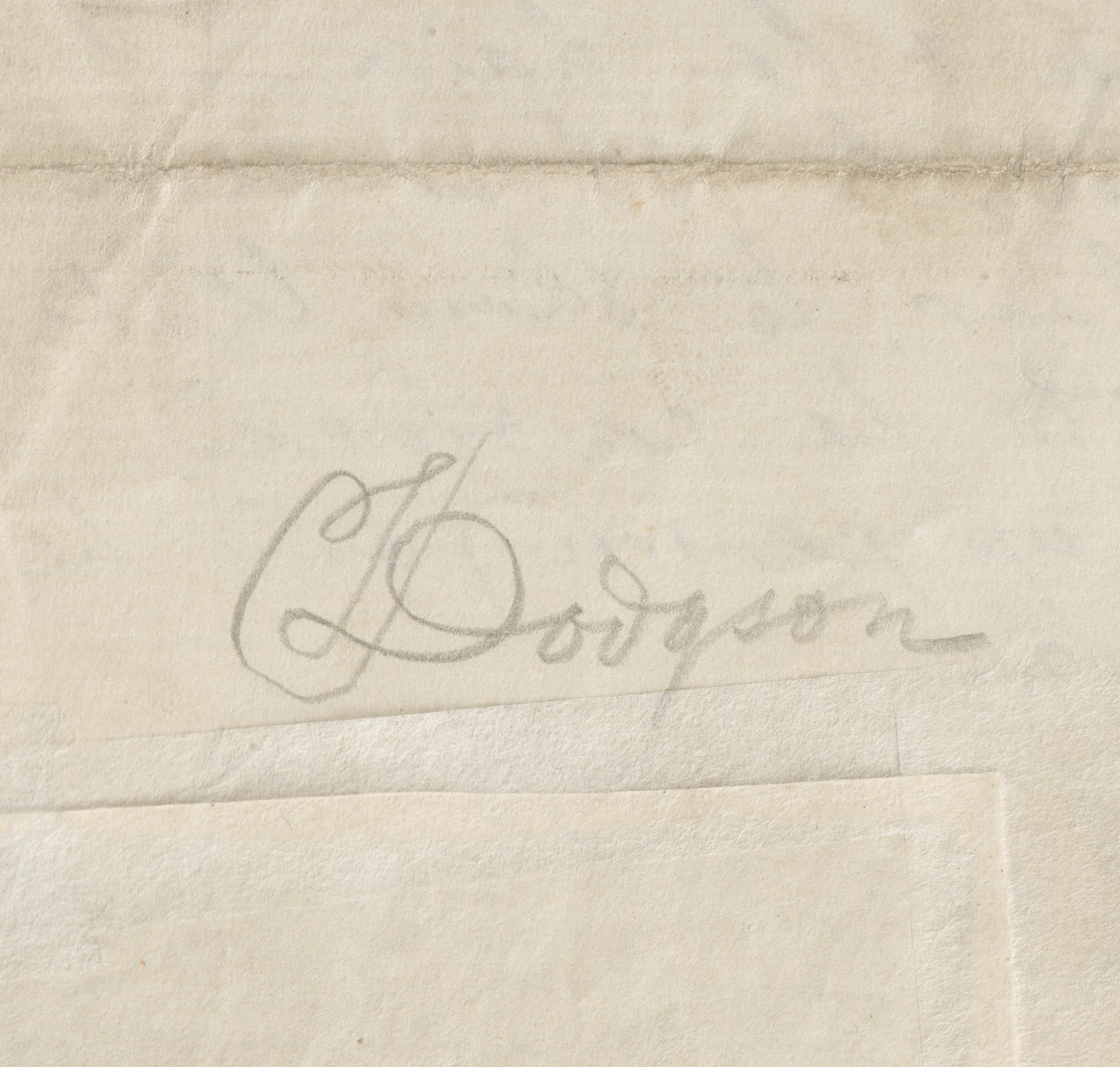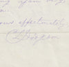 The three page letter is written on two adjoining sheets, measuring 4.5 x 7", and is in fine condition. Dodgson's signature at the bottom of the letter has been clipped, and replaced with a facsimile.