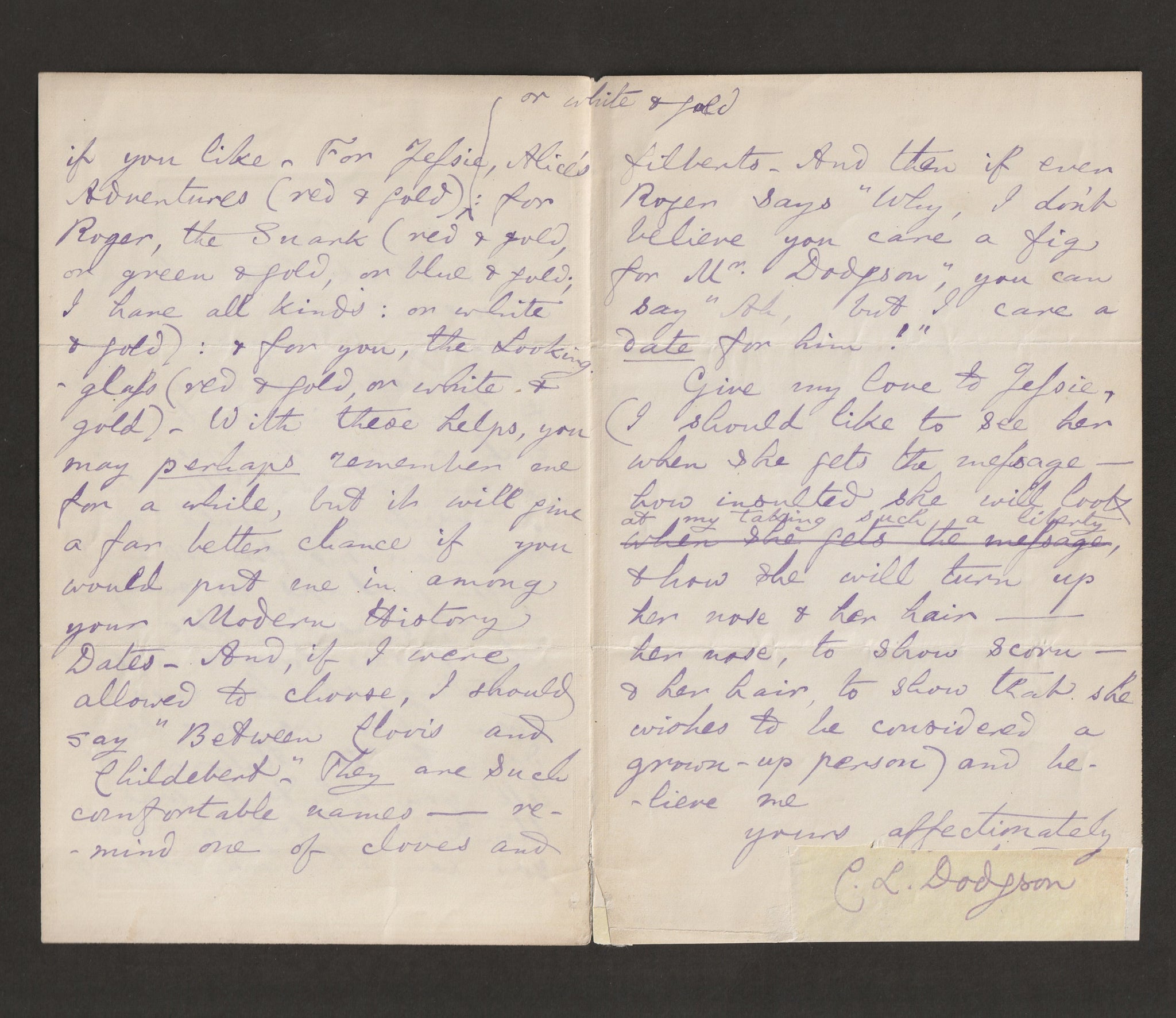 "With these helps, you may perhaps remember me for a while, but it will give a far better chance if you would put me in among your Modern History dates…—And then if even Roger says ‘Why, I don’t believe you care a fig for Mr. Dodgson,’ you can say ‘Ah, but I care a date for him!’"