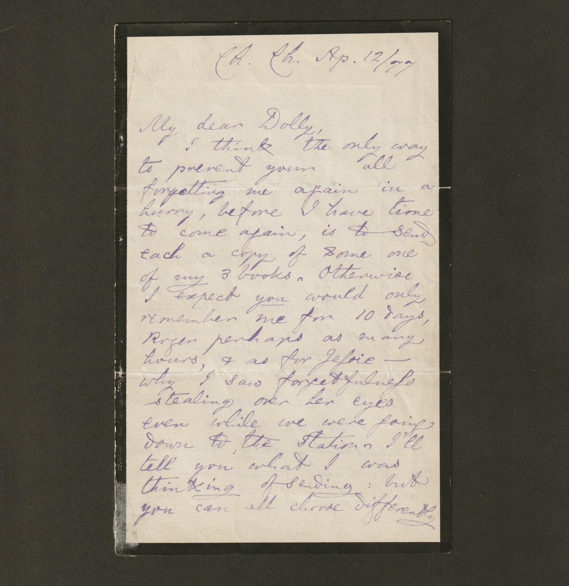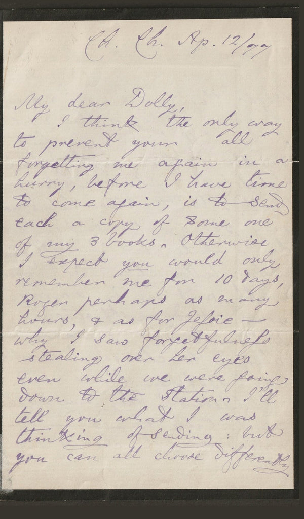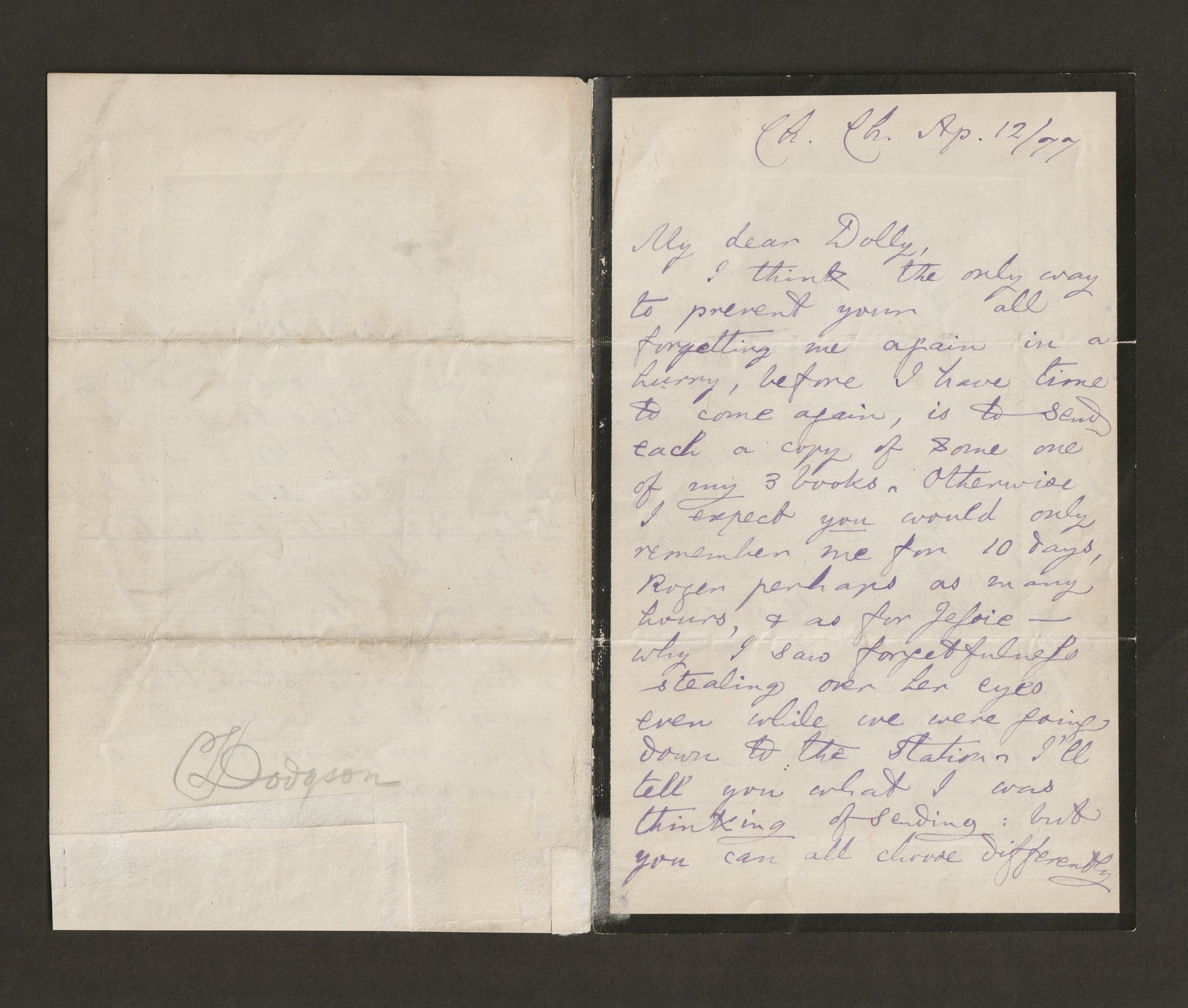 In the second letter, dated April 12, 1877, Dodgson mentions sending Draper and her family copies of his most famous books, and also includes a piece of nonsense wordplay typical of his work: