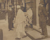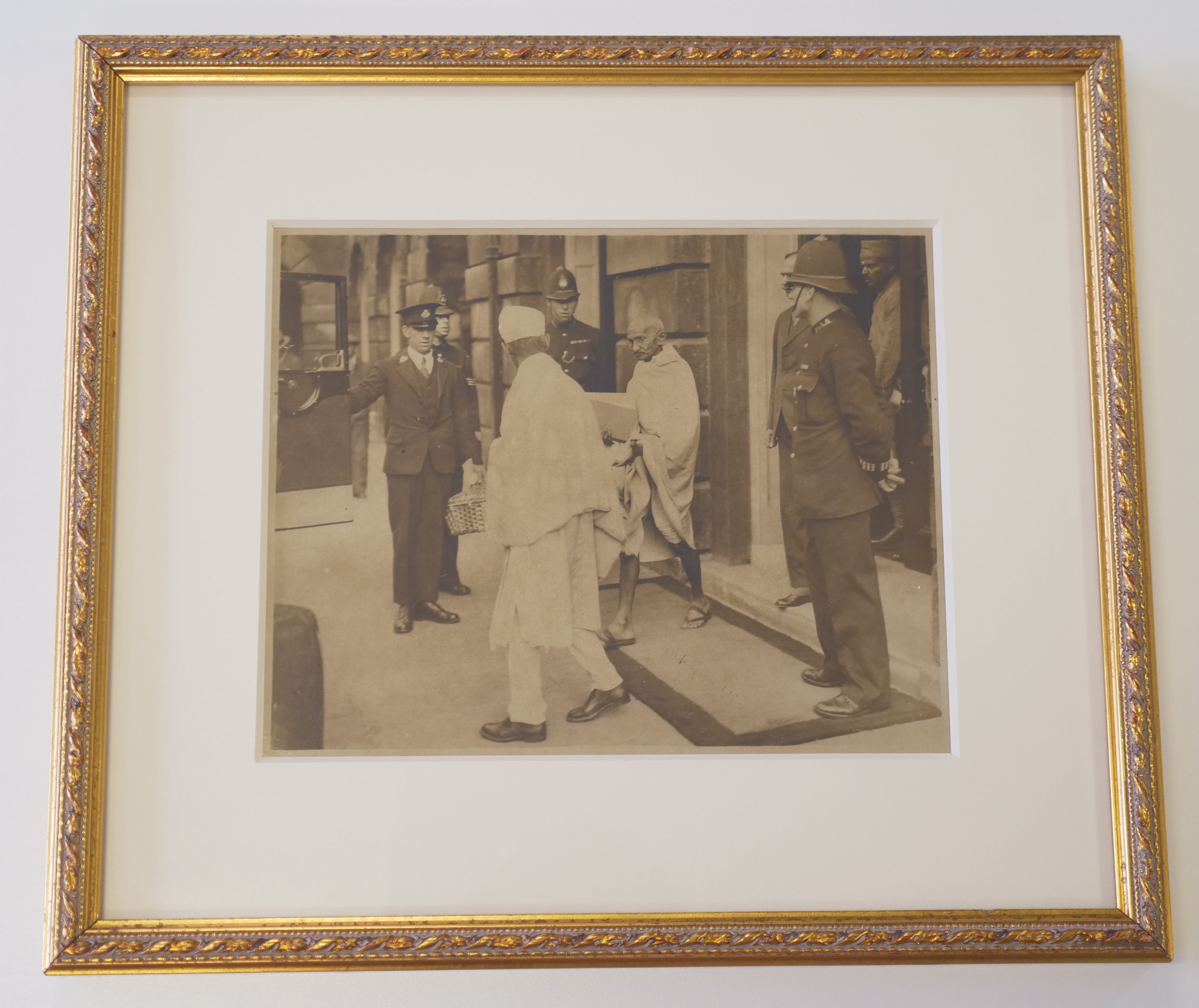 The 23.3 x 18.5 cm press photograph shows Gandhi leaving the Second Indian Round Table Conference in London in 1931 – likely September.