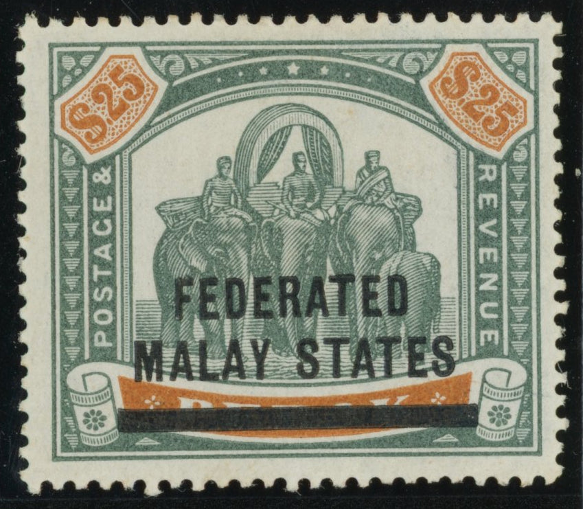 The Federated Malay States consisted of the states of Negri Sembilan, Pahang, Perak, and Selangor. In 1900 they produced an eight stamp issue overprinted on the stamps of Negri Sembilan and on six Perak stamps, which are much rarer.