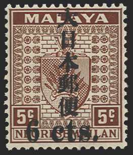 Malaya Japanese Occupation 1942-44 Negri Sembilan 6c on 5c brown, type 2 'Kanji' overprint with type 21 surcharge (applied in one operation), ERROR OVERPRINT AND SURCHARGE DOUBLE, SGJ268b.
