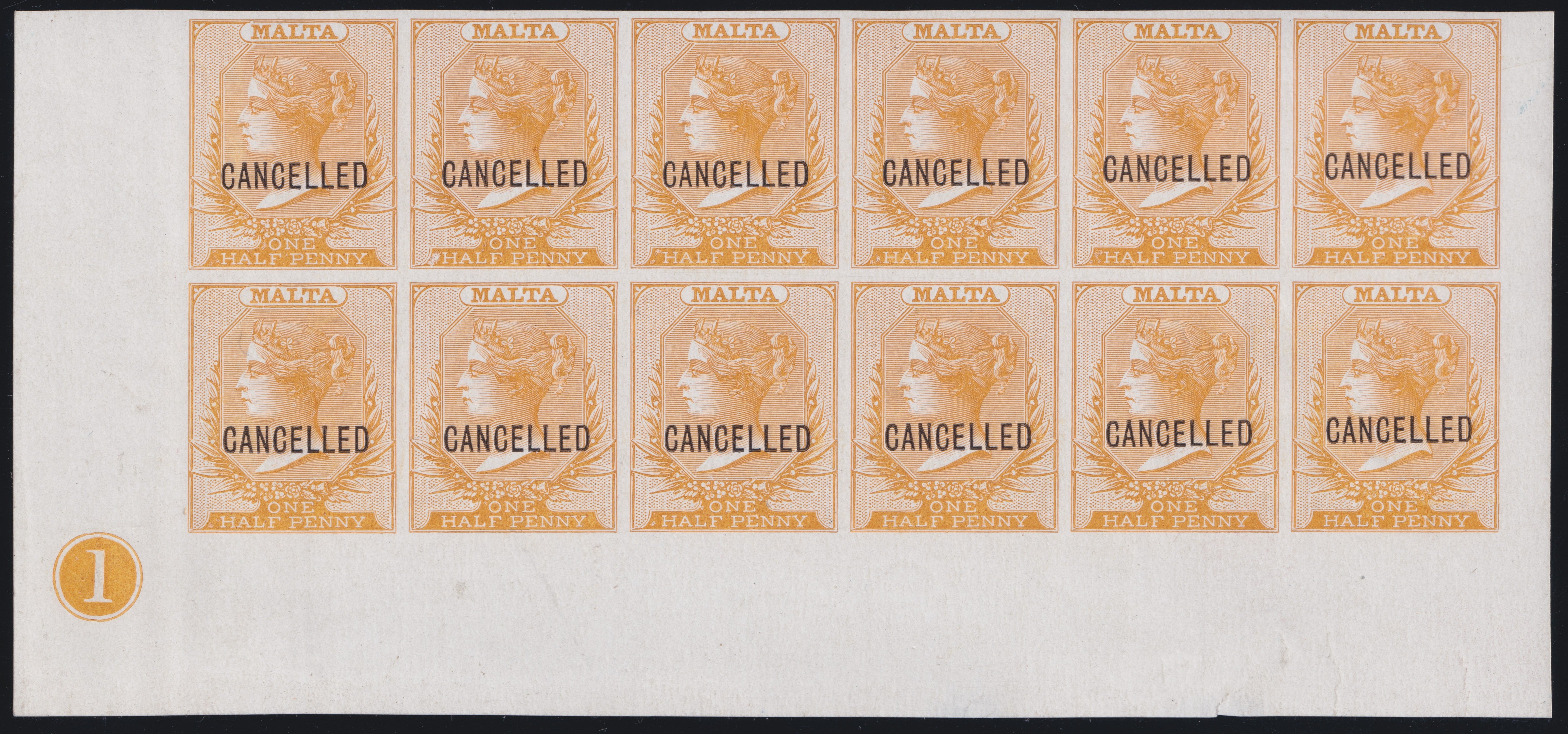 Malta 1872(c.) ½d yellow-buff imperforate plate proof in thick glazed wove, 'CANCELLED' (type D7), SG10.