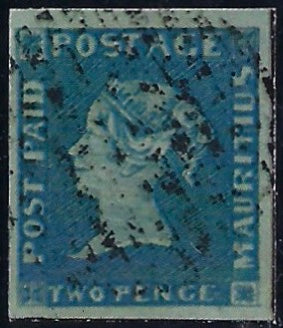 Mauritius 1848-59 'POST PAID' 2d deep blue, early impression (close to earliest) on medium yellowish paper, position 6 on sheet, SG9.
