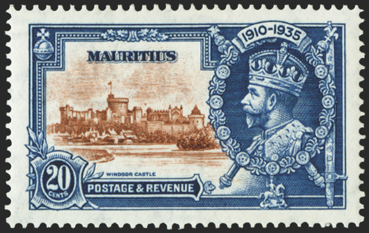 Mauritius 1935 Silver Jubilee 20c brown and deep blue, variety 'Dot to left of chapel' from vignette plate '2B', R8/3, SG247g.