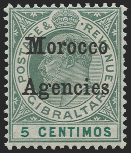 Morocco Agencies 1905-06 5c grey-green and green, watermark MCA, ordinary paper, variety Broad top to 'M', SG24b.