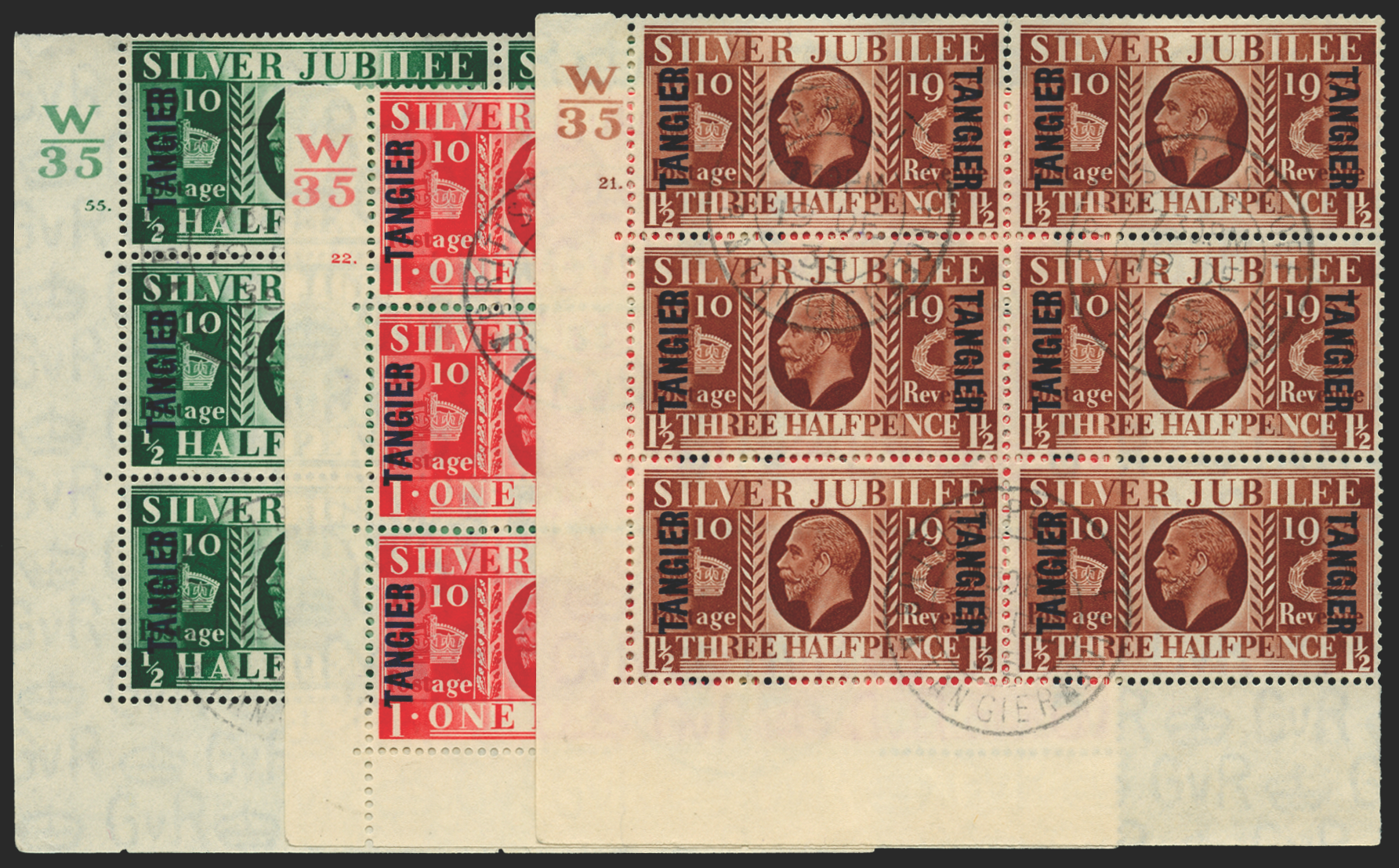 Morocco Agencies Tangier 1935 Silver Jubilee set of 3 (½d green, 1d scarlet, 1½d red-brown), in matching lower left corner blocks of 6 (2x3) with "W35" control, respectively showing cylinder numbers "55", "22" and "21", SG238/40.