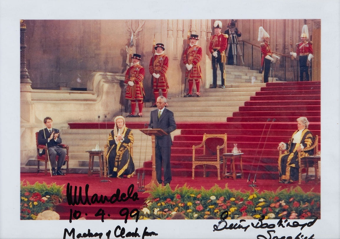 The photograph is signed boldly by all three in black ink. Mandela has also dated his autograph "10.4.99".