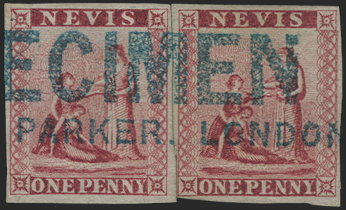 A rejoined horizontal pair (positions 2-3 on the sheet), respectively with large and clear to large margins, with large part strike of the dramatic '(SP)ECIMEN/(NISSEN &) PARKER. LONDON' HANDSTAMP in blue, for use as printer's samples.
