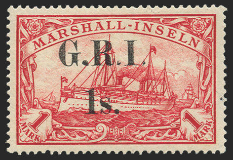 When the Australian Naval and Military Expeditionary Force occupied German New Guinea in 1914, it overprinted existing stocks of the German New Guinea Marshall Islands stamps with the initials "G.R.I." (Georgius Rex Imperator), referring to King George V. They were only used for a short period of time and are, therefore, very rare and most surviving examples have condition flaws.